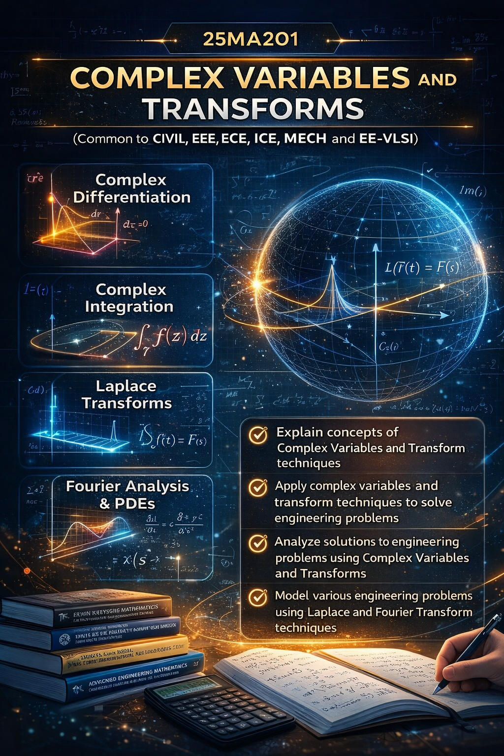 The course Complex Variables and Transforms (25MA201) introduces fundamental mathematical techniques used in engineering analysis. It focuses on complex analysis, Laplace transforms, Fourier analysis, and partial differential equations (PDEs), which are widely applied in fields such as electrical, civil, mechanical, and electronics engineering.